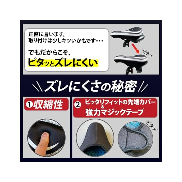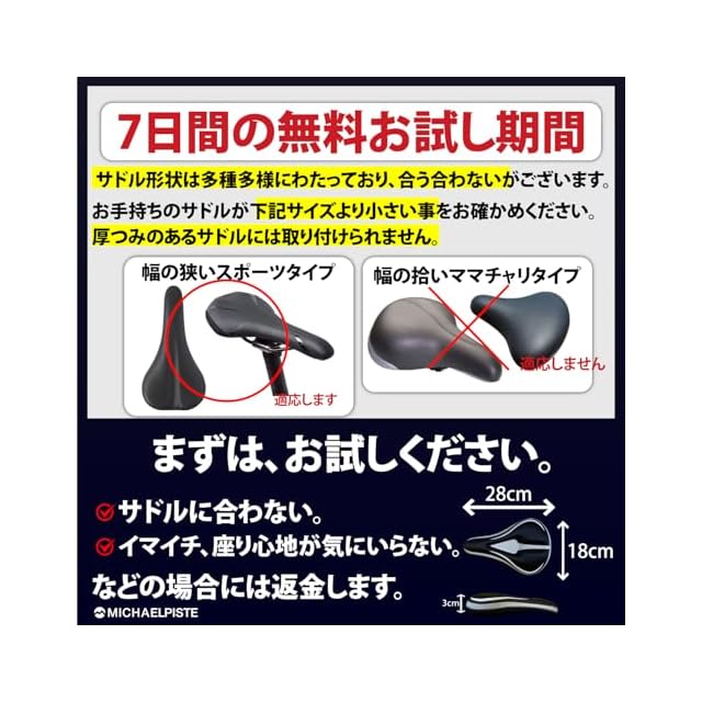 【お手持ちのサドルサイズをご確認ください】幅の狭いスポーツタイプのサドルにご使用いただけます。ママチャリなどの幅広タイプには使用できません。サドルカバーのサイズは、28CM×18CMです。サドルの形状は多種多様であり、すべてのサドルに適応するとは限りません。サドルカバーは収縮性はありますが、製品の特性上致し方ない事実として、お手持ちのサドル形状上、適応しない可能性があります。 ※サドルカバーは収縮性はありますが、製品の特性上致し方ない事実として、お手持ちのサドル形状上、適応しない可能性があります。また、臀部への負担の軽減には個人差がございます。