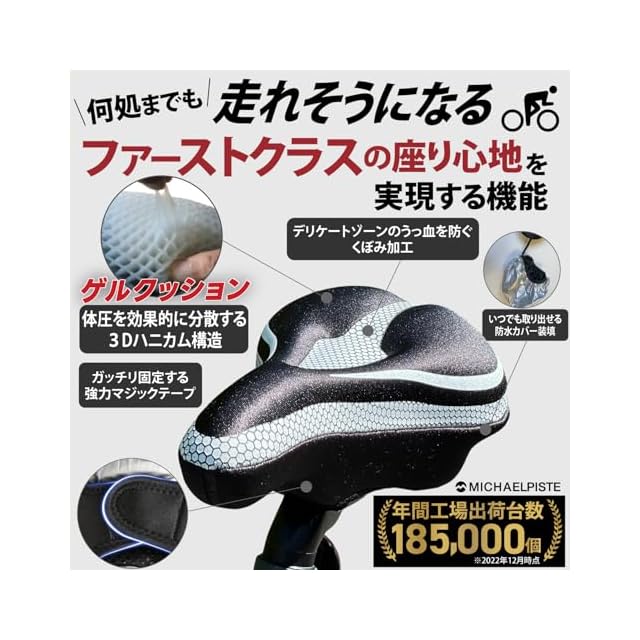 【3Dハニカム構造が体圧を分散】 痛くない魅力的な座り心地を提供するサドルカバーは、3Dハニカム構造で体圧を効果的に分散。自転車やエアロバイクでのサイクリングが快適なサドルクッション体験へと昇華します。