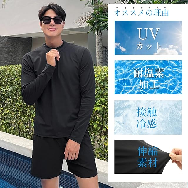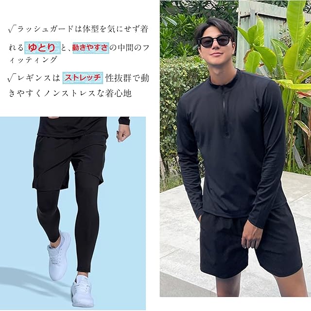 [Adigaber] ラッシュガード メンズ 水着 3点セット 上下 フィットネス 長袖 パーカー レギンス サーフパンツ ハーフジップ UVカット 吸汗速乾 水泳 水陸両用 大きいサイズ | つむぎ屋