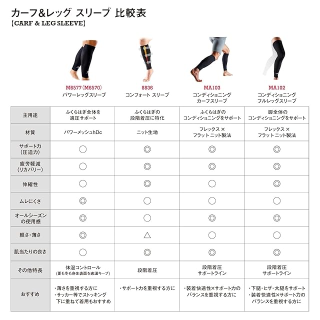 (ふくらはぎ周囲/cm) S : 29〜34 M : 33〜39 L : 38〜45 ●装着位置目安:上端部がヒザ上5〜10cmの位置