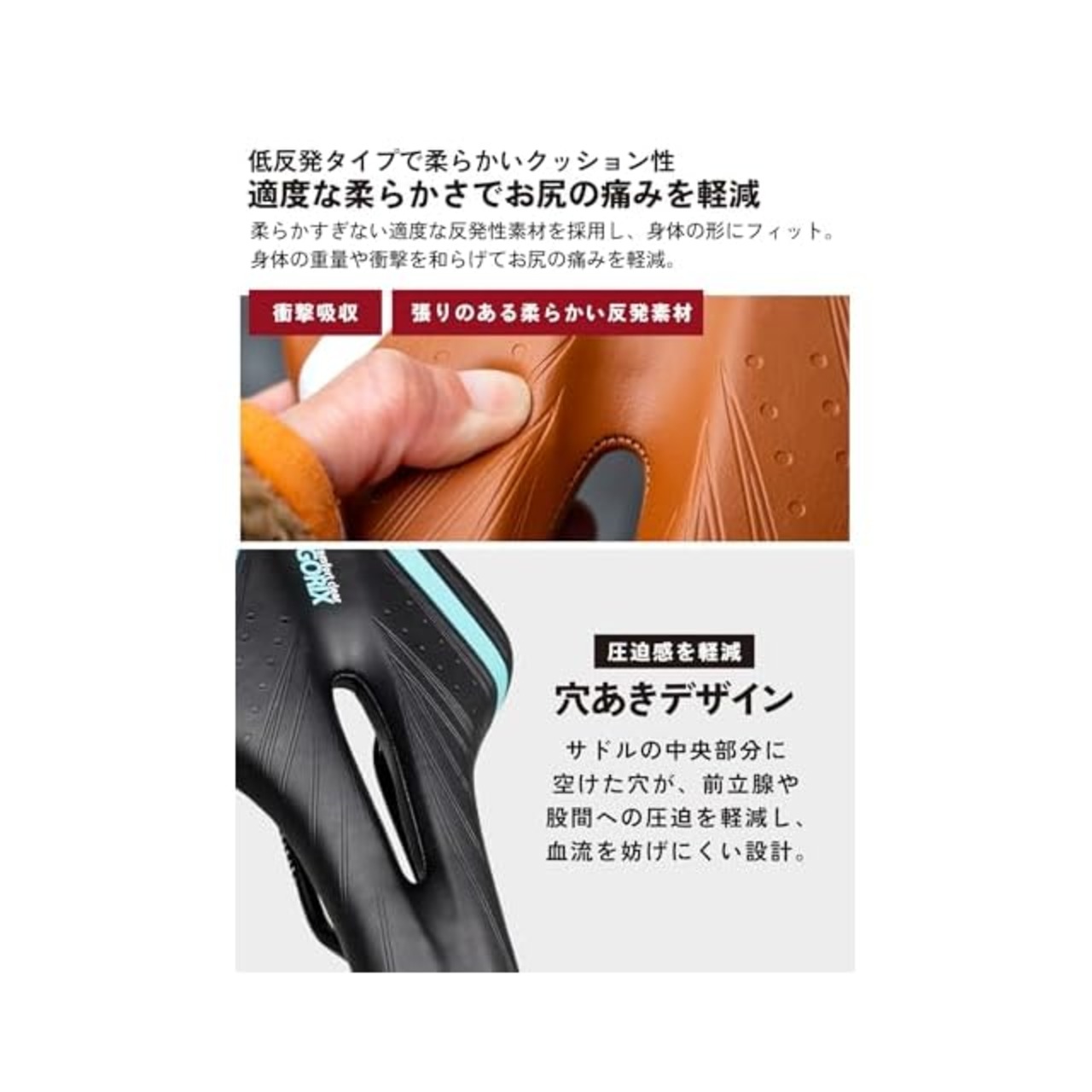 【地面からの衝撃を吸収】バックは大きなラウンド形状なので、安定して長く座れる柔らかい低反発タイプのサドルです。底面以外の厚みは、厚手のクッション素材、張りのある柔らかい反発素材で、身体の重量や衝撃を和らげてお尻の痛みを軽減してくれます。