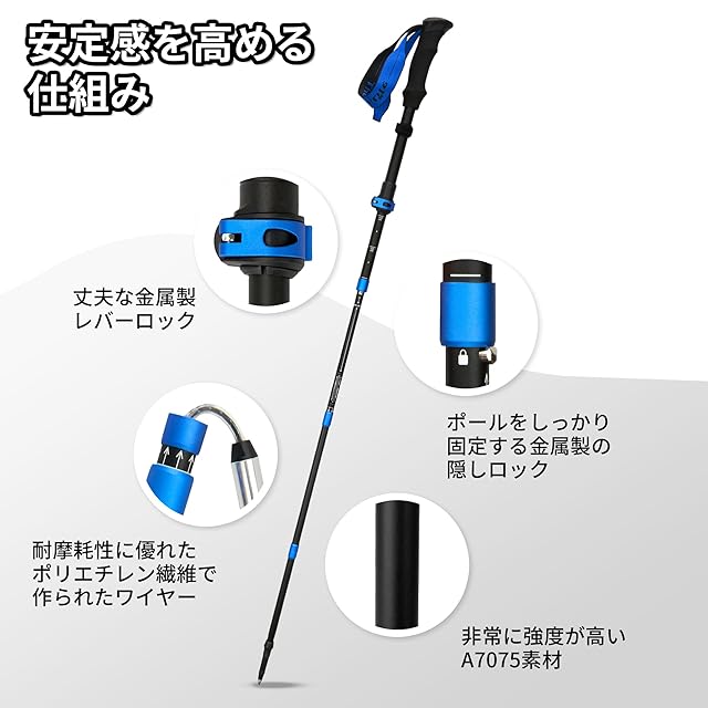 【丈夫・安定感抜群】TheFitLifeのトレッキングポールは、航空業界で使用されているA7075素材(アルミニウム合金の一種)で作られていて、非常に強度が高いです。また、金属製レバーを利用してポールを固定することで安定感が抜群ですので、歩行中腰や膝関節のストレスを軽減します。