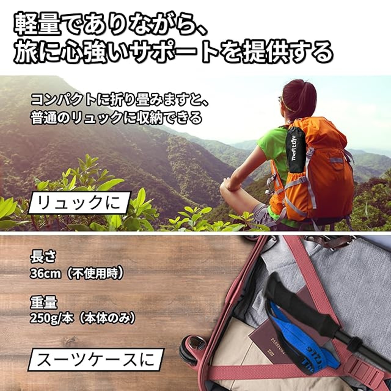 【ポールは軽いほど良い】軽いポールを使用することで、腕が疲れにくくなります。TheFitLifeの折畳み式のトレッキングポール1本の重量はわずか0.25kgですので(本体のみ)、長い距離の登山にはずいぶん役が立っています。ポールが軽ければ、体力回復しながら長い距離を歩けることは遥かに簡単になります。