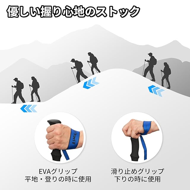 【快適なグリップ感】人間工学に基づいたEVAグリップは手のひらにフィットして使いやすさ抜群!どんな地形においても滑り止めの仕様で手汗を吸収し、登山中に手を快適に保ちます。調節可能なストラップを使用することで、休憩時に両手を解放して、手のひらのストレスが軽減されます。
