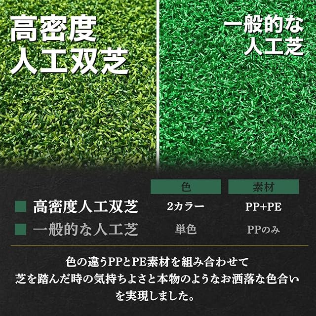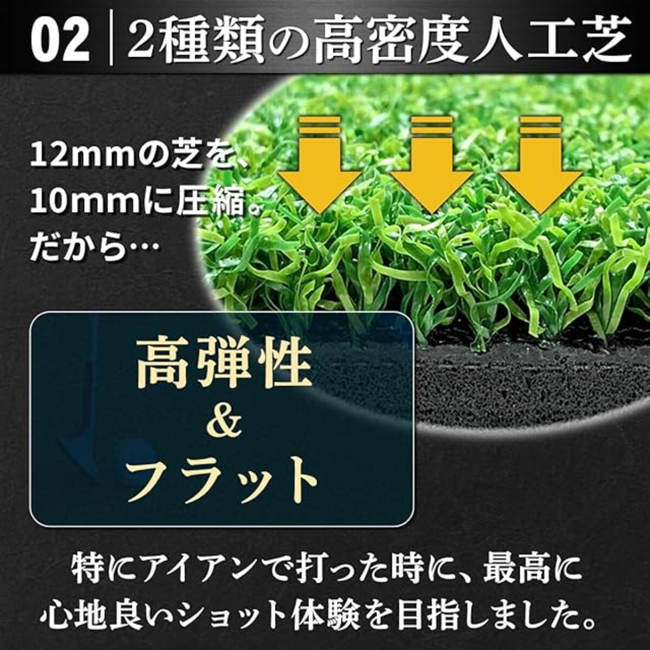 【2種類の高密度人工芝】元12mmの芝を圧縮して10mmにすることで高弾性があり、フラットな作りにしました。また硬さの違うPP芝+PE芝を組み合わせたことで最高に心地よいショットが打てるようになりました。