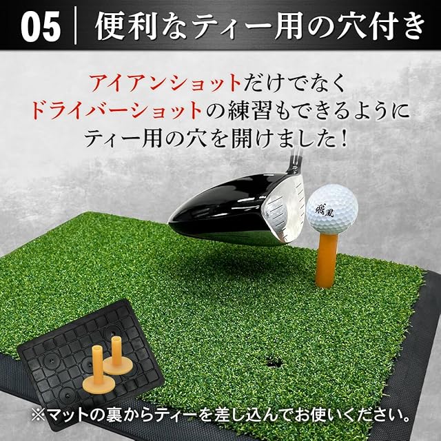 【便利なティー用の穴付き】アイアンショットだけでなく、ドライバーショットの練習もできるようにティー用の穴を開けました。様々な打ち方を試せる利便性の高いマットになっております。