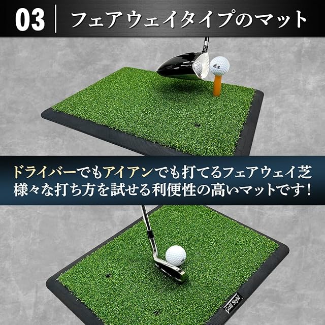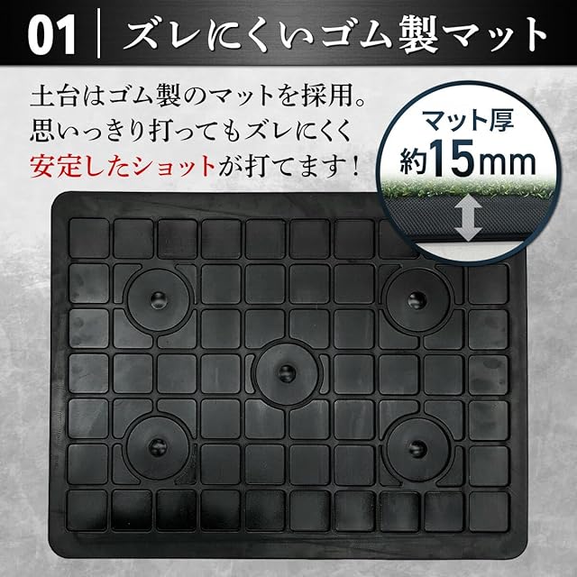 【ズレにくいゴム製土台マット】思いっきりショットを打ってもずれないように土台にはゴム製マットを使用。一般的なEVA製マットやSBR製マットだとショットした瞬間動いてしまい、いちいち元に戻す作業が発生しますが、ゴム製マットは重さがあるので簡単には動きません!