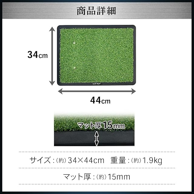 ⛳【サイズ】約34cm×44cm×厚さ15mm※写真参照 【重量】約1.9kg 【カラー】グリーン 【素材/材質】ゴムマット、PP(ポリプロピレン)芝+PE(ポリエチレン)芝 【セット内容】ゴルフマット単品