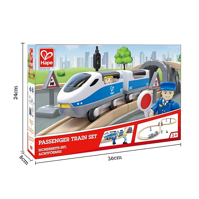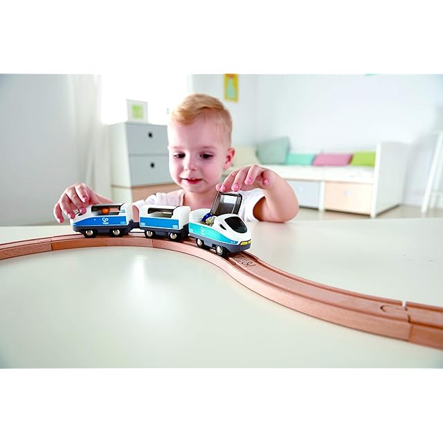 レール遊びを盛り上げる、特急電車セットです。スイッチを入れるとモーターの力で電車が走る電動式電車です。スイッチの切り替えで前にも後ろにも走ります。ハッチを開けて人形を乗せることもできます。ハペのレールシリーズといっしょに楽しめるので遊びの幅が広がります。