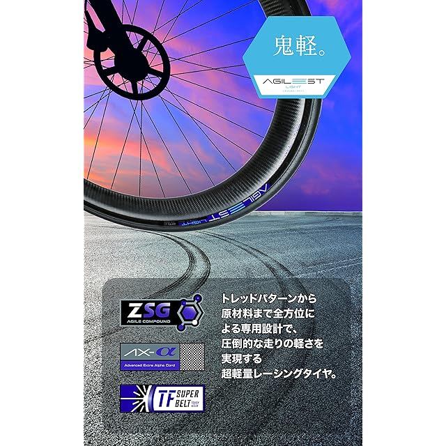 【鬼軽】トレッドパターンから原材料まで、全方位に及ぶ専用設計で超軽量を実現したモデル。トレッド下には耐パンクベルトを備え、超軽量ながら扱いやすいタイヤです。