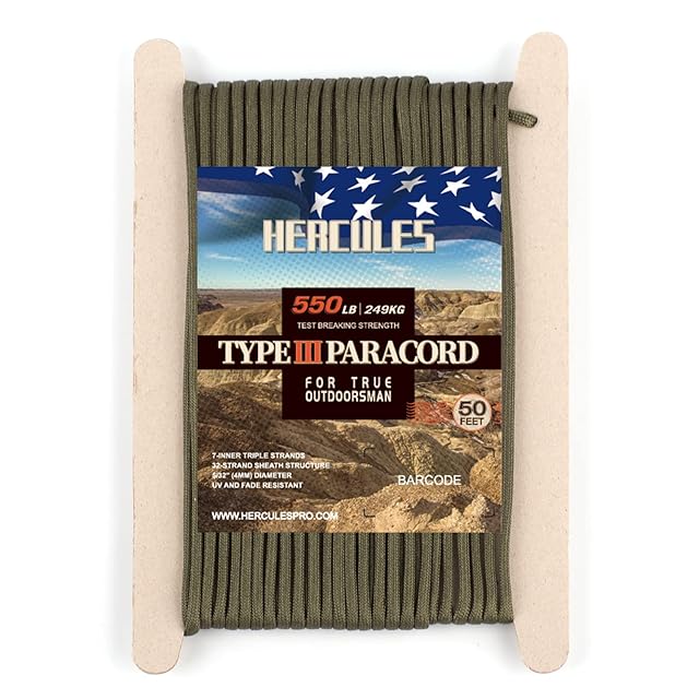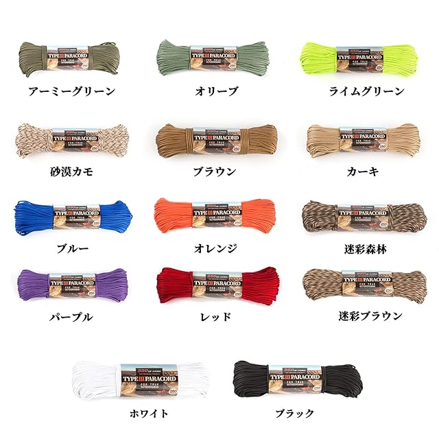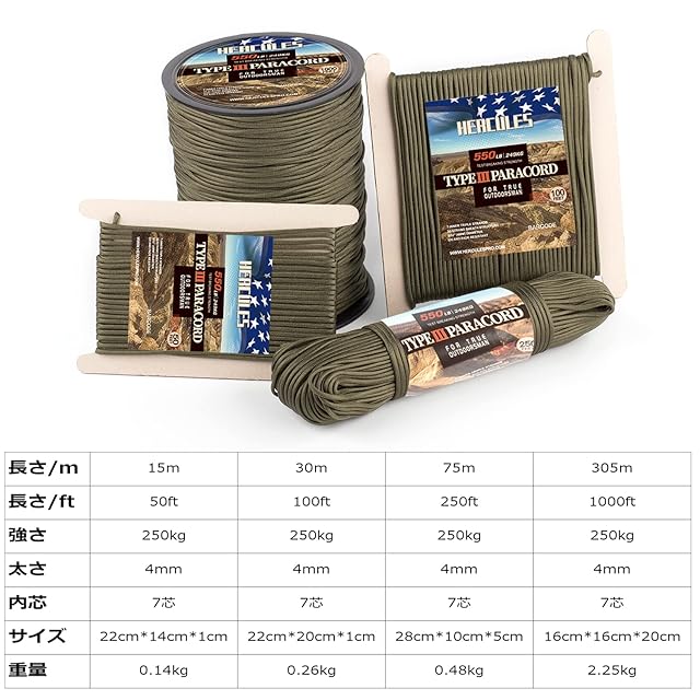 材質:表地:ポリエステル、内芯:ナイロン、直径:約4mm、長さ:15m/50ft、カラー:アーミーグリーン。