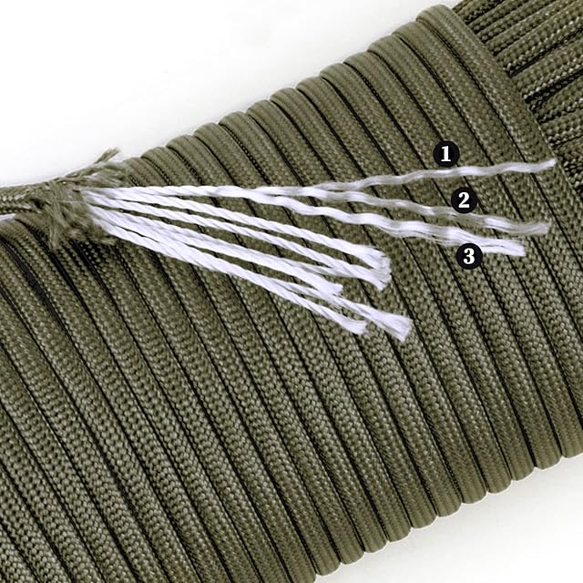 耐荷重が高い:「550パラコード」として約4mmの太さで、しっかりしていて550ポンドの荷重に耐えられます。1本のロープに7本の芯を採用しており、1芯は3本の縒り糸を束ねて作製られています。