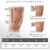 【ヒザに的確フィット、圧迫力も調節自在】正面のアジャスタブル面ファスナーで、ヒザ・太ももの形状に的確にフィット。圧迫力の調節も自在です。