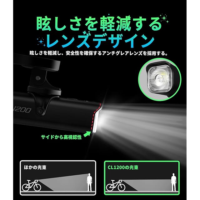 5000mAh大容量と高輝度&眩惑防止:アルミ合金製で大容量5000mAhのバッテリーを内蔵、最大12時間(フラッシュ)連続で長時間ご利用いただけます。CL1200自転車フロントライトは防眩レンズを備えており、上の配光をカットして、対向車や歩行者に対して配慮した安全な光を照らすことで、眩しさが軽減でき、事故を未然に防ぐことができます。最大出力1200ルーメンで、照射距離は最大約160メートルまで達します