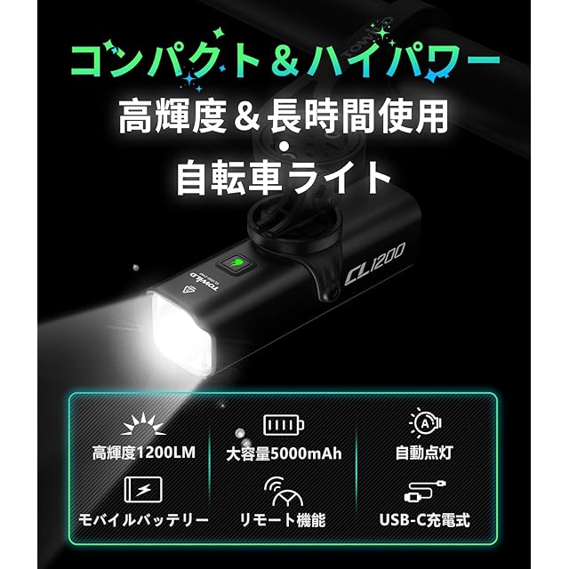 TOWILD CL1200 自転車ライト 充電式 1200ルーメン 高輝度 5000mAh大容量 自動点灯 ロードバイクライト リモコン対応 防眩レンズ IPX6防水 下付け可能 ロードバイク/クロスバイク/MTB対応 自転車フロントライト LEDヘッドライト | つむぎ屋