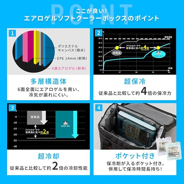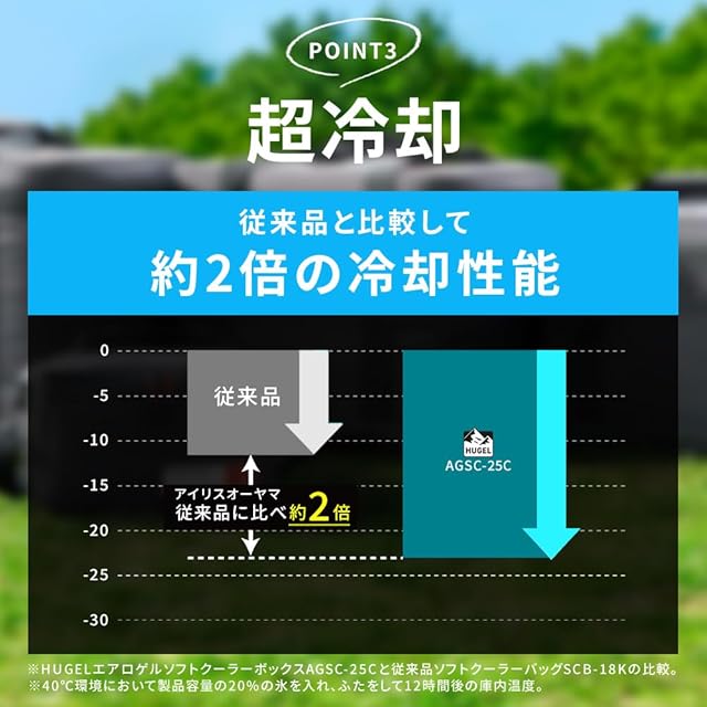 宇宙服にも使用される、高断熱素材“エアロゲル”を使用したソフトクーラーボックス。冷気が逃げにくく、ハードタイプに負けない保冷力。最大保冷時間:約5.1日(※)。(※本体容量40%相当の氷を入れ、底面温度が8℃に達するまでの時間。環境温度:30℃→9時間・20℃→15時間の繰返し。)