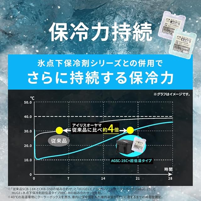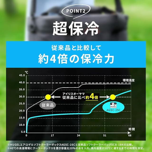 宇宙服にも使用される、高断熱素材“エアロゲル”を使用したソフトクーラーボックス。冷気が逃げにくく、ハードタイプに負けない保冷力。最大保冷時間:約5.4日(※)。(※本体容量40%相当の氷を入れ、底面温度が8℃に達するまでの時間。環境温度:30℃→9時間・20℃→15時間の繰返し。)