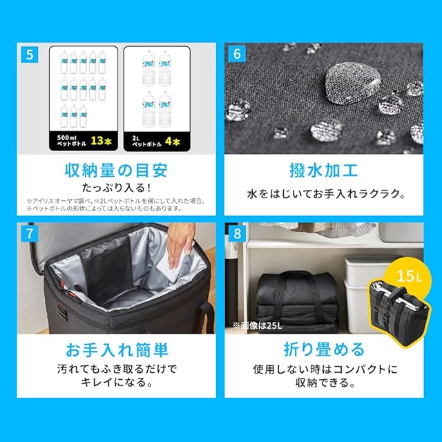 【折りたたみ可能】コンパクトに折りたためるから、持ち運びや収納にも便利。【お手入れ簡単】裏面は水がしみにくいPVC素材で、汚れもふき取りやすい。【災害時も便利】冷蔵庫が使えないときの一時的な保管にも。ソフトタイプだから持ち運びにも困りにくく、避難先でも役に立つ。