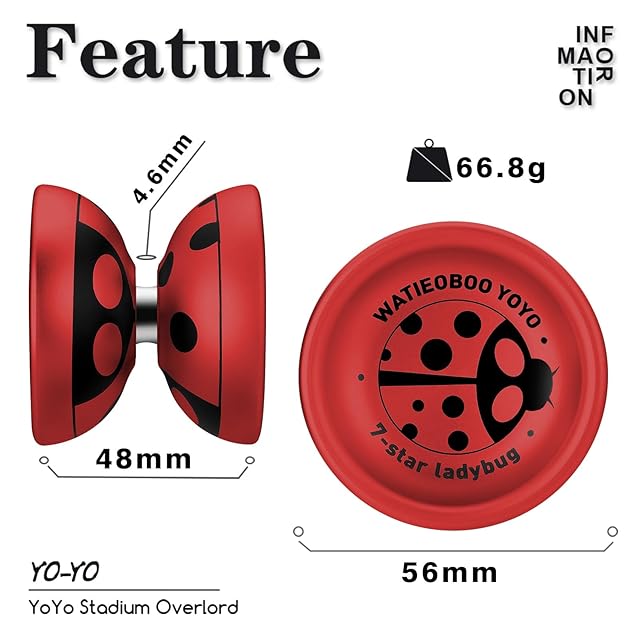 WATIEOBOO yoyo アルミニウムメタルヨーヨー: 7-Star Ladybug Yoyoは、アルミニウム合金ボールシェルとステンレススチールベアリングを備えた高精度の航空宇宙グレードの材料から作られています。 これらの強化により、アルミニウム ヨーヨーの衝撃と落下抵抗が向上します。 スムーズに回転し、強力なアイドリング機能を発揮するバタフライヨーヨーは、ゲームや日常の練習に最適です。