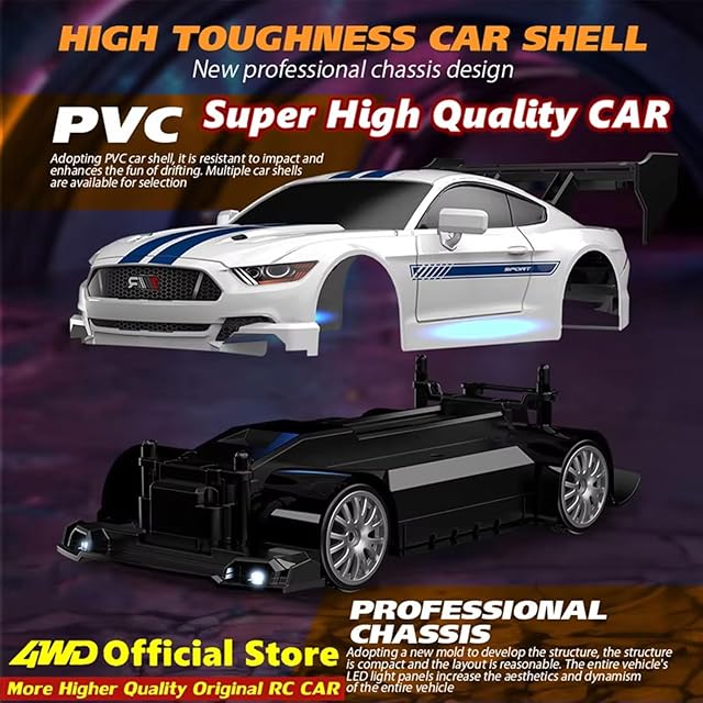 高速4WDラジコンドリフトカー】この高速4WDラジコンドリフトカーは絶妙なデザインで、本物のレーシングドリフトとスピードドライブの楽しさを復元し、スピードは30KM/Hに達し、よりリアルな高速レース体験をもたらします。車のフロントにはクールなライトがあり、夜の運転はより魅力的です。