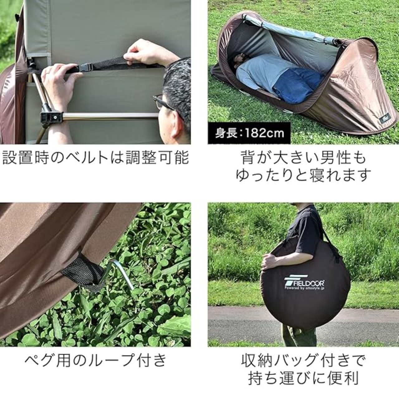 ✅【商品詳細】 サイズ 使用時 : (約)230cm×70cm×70cm 収納時 : (約)φ70cm×4cm 重量 (約)1kg 材質 生地 : ポリエステル フレーム : グラスファイバー 付属品 ・テント本体×1 ・ペグ×4 ・専用収納バッグ×1 ・取扱説明書(日本語) ※商品は、モニターによって色合いが異なって見える場合があります。 ※仕様・デザインは改良のため予告なく変更することがあります。