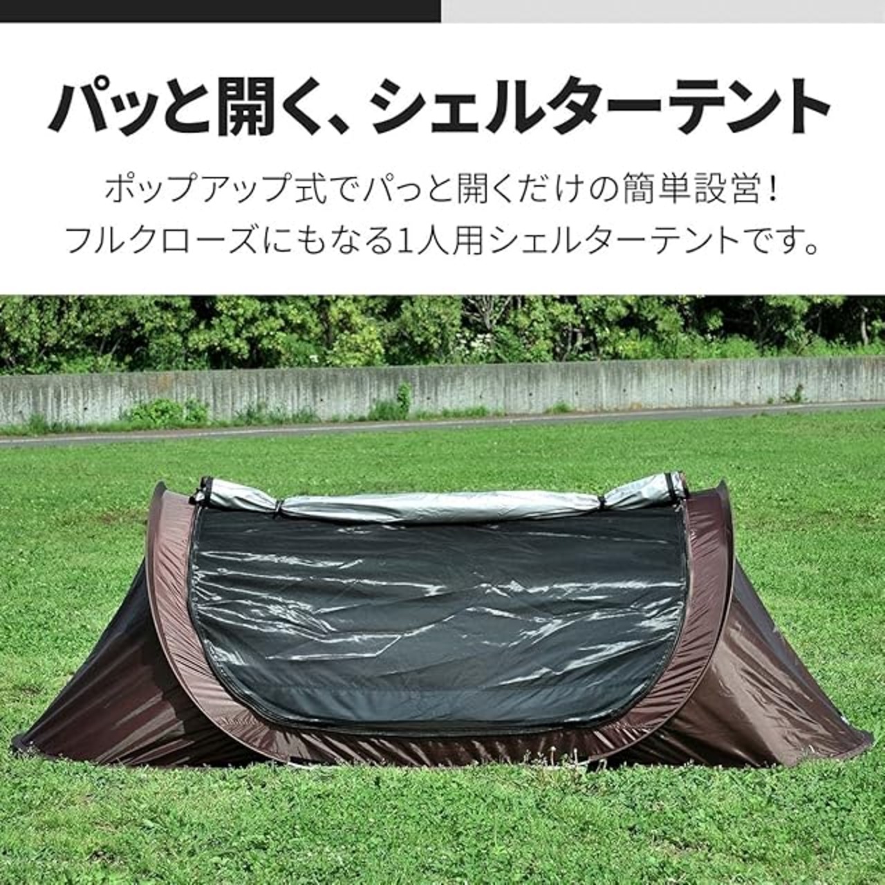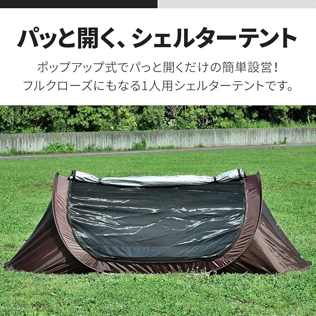 ✅【ポップアップ式のカンタン設営! パッと開くシェルターテント】 パッと開くだけで組み立て簡単!1人用のポップアップシェルターテントです。フルクローズになるのでタープ泊にも◎
