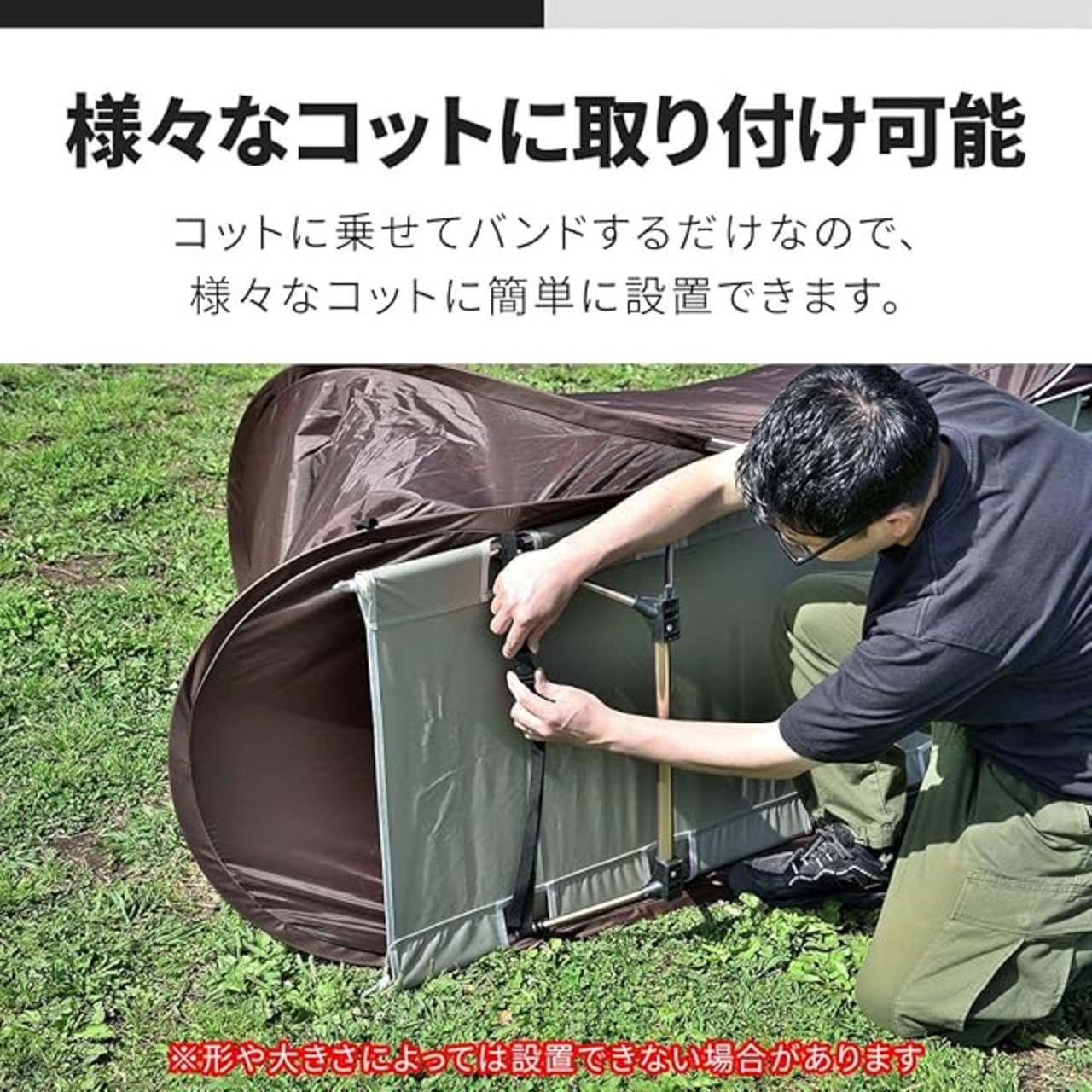 ✅【様々なコットに取り付け可能!】 コットに乗せてゴムバンドするだけなので、 様々なコットに簡単に設置ができます。 インナーテントを使用しないキャンプなどに ピッタリなアイテムです。