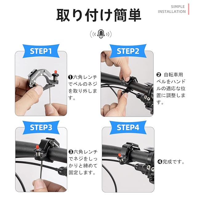 【取り付け簡単】➊六角レンチでベルのネジを取り外します。➋ 自転車用ベルをハンドルの適応な位置に調整します。❸六角レンチでネジをしっかりと締めて固定します。➍完成です。(六角レンチが付属しています)うれしいポイントもあります。ベルのネジに紛失防止のワッシャーが付属しているので、取付の過程にネジをベルにしっかりと固定してネジを失くしにくいです。