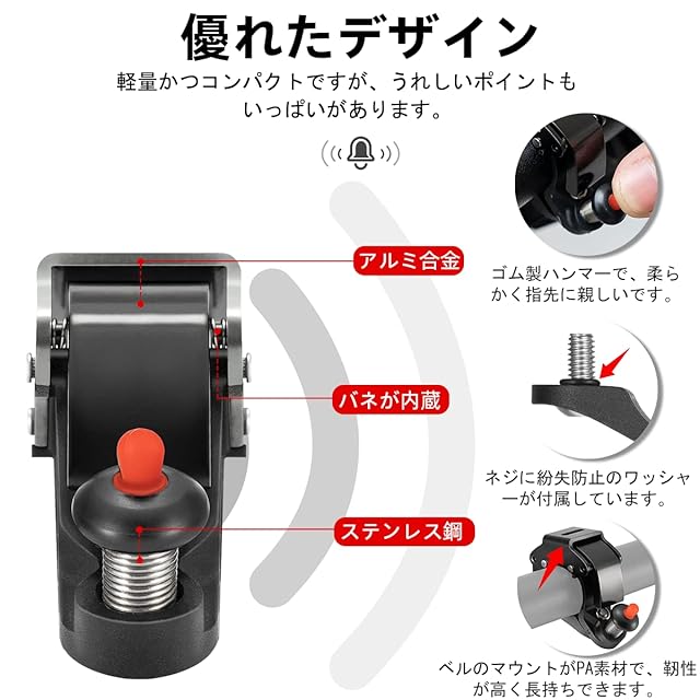 【大音量・爽やかな音色】他社の押しにくいハンマーと違って、当社のサイクルベルの上に赤いゴム製バネボダンを設置して、柔らかく指先に親しくてちょっとだけかくと、混ざりのないリーンと透明感のある爽やかな音を立てます。90-100dB(デシベル)程の大音量は音質が良くて喧騒に溢れた車の多い通りでもしっかりと音が届きます。安全対策を重視したい場合におすすめです。(受取の後、ベルをテストする時に、上のマウントを挟まないでください)