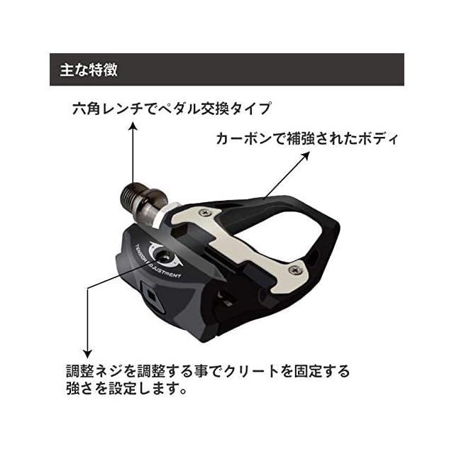 本商品はシマノ株式会社製『SPD-SL』に対応させてご使用いただくことが可能な商品です。 ペダル本体の調整ネジを調整することで、クリートを固定する強さを設定できます。