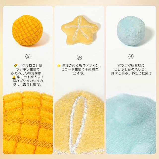 【感覚統合・知育にぴったり】 視覚・触覚・聴覚を同時に刺激することで、赤ちゃんの感覚統合能力や知育発達に効果的!初めてのおもちゃとして、または出産祝い・誕生日プレゼントにも最適です。