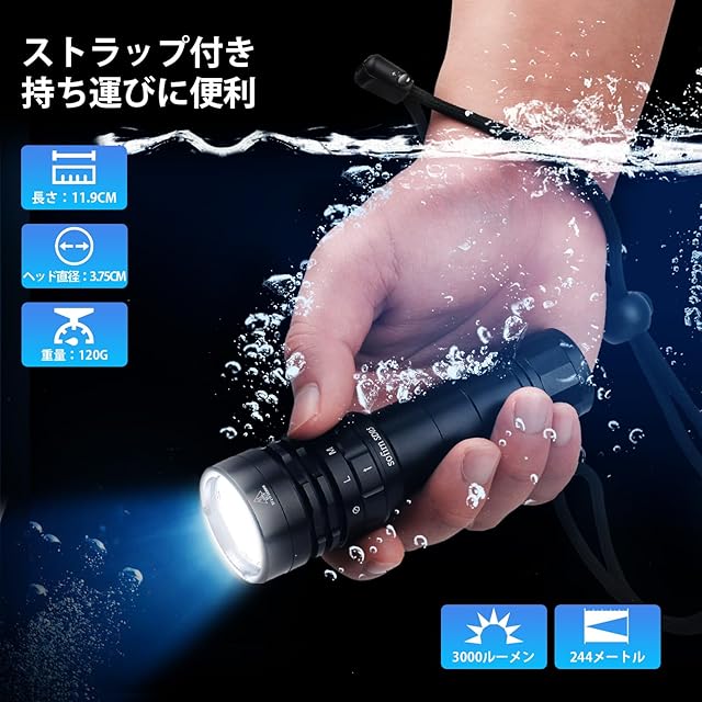 商品名:Sofirn ダイビングライト 3000ルーメン 水中100メートル マグネットリング スイッチ 三つ点灯モード 超高輝度 LED 懐中電灯 耐衝撃 探検 ナイトダイビング 水中ライト 釣り キャンプ 防災グッズ 日本語説明書付属