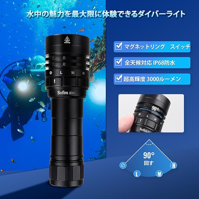 Sofirn ダイビングライト 3000ルーメン 水中100メートル マグネットリング スイッチ 三つ点灯モード 超高輝度 LED 懐中電灯 耐衝撃 探検 ナイトダイビング 水中ライト 釣り キャンプ 防災グッズ 日本語説明書付属