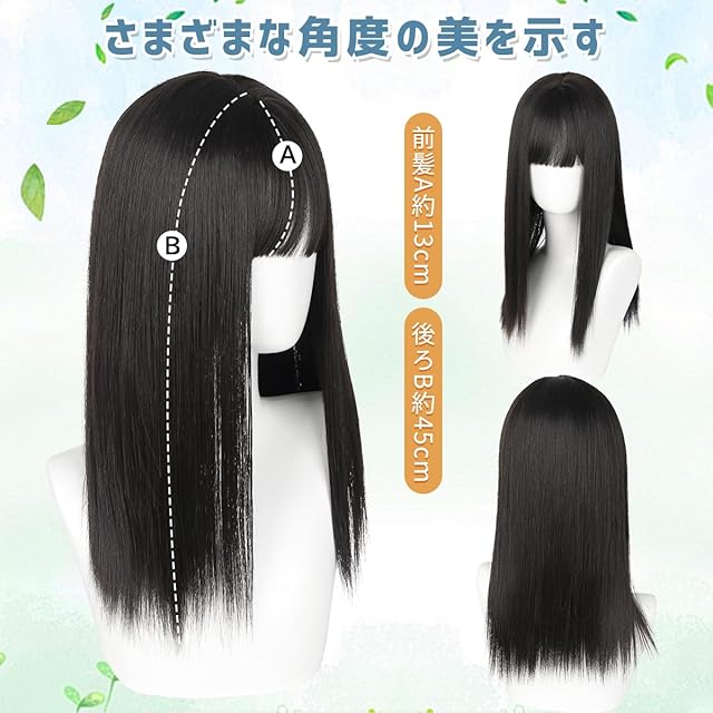 【ウィッグ情報】①サイズ:前髪生え際から毛先まで約13cm。後髪頭頂部から毛先まで約45cm。②重さ:約200g;③頭周り:約53cm-58cm(伸縮自在のアジャスターで頭の大きさや形によって柔軟にフィットさせられる)。④ご使用のパソコンのモニター設定や部屋の照明により、実際の商品と若干色味が異なる場合があります。⑤静電気や絡まる場合は柔軟剤やトリートメントでケアすれば大丈夫です。