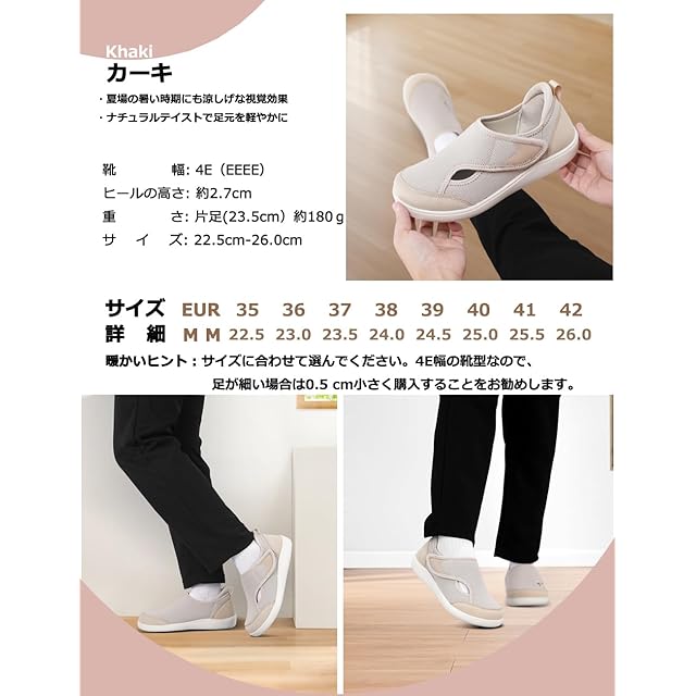 [JIAFO]【介護シューズ 幅広4E 理学療法士推薦】介護靴 レディース リハビリシューズ 女性用 高齢者 マジックテープ 婦人 スニーカー 大人 上履き 入院 軽量 滑り止め 通気性 室外 室内履き (カーキ, 大人, 23.5 cm, 数値, 日本の靴のサイズ寸法)