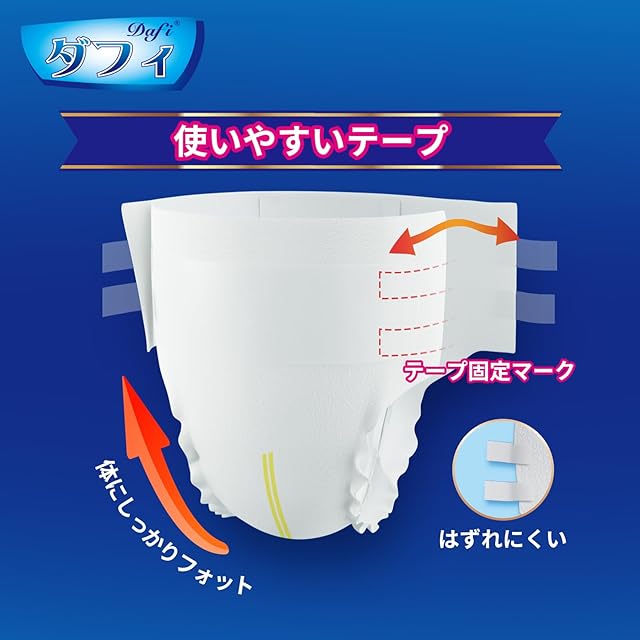 【何度もテープ】ダフィのテープ止め 紙おむつ は使いやすくて何度でもつけるテープが付き、体にフィットさせやすい、すきまをつくらないからモレ防止にも効果的です。