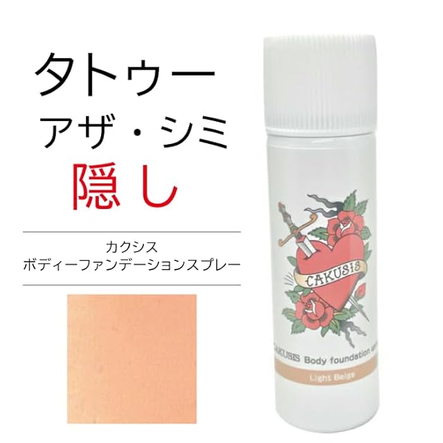 【お知らせ】※3520円の新ライトベージュの色味は2024年6月下旬~のライトベージュより色白系の明るい肌色です。(2025.1月下旬時点)※新ライトベージュの価格は3520円(税込)となります。原価高騰のためご迷惑をおかけし申し訳ありません。※ラベルについて。現在は共通缶で印刷し色名・JANコードを上貼り付けしています。 ★タトゥー 隠しスプレー。アザ・シミ・タトゥー隠しスプレータイプ4色のカラー展開で肌に近い色を実現します。 ★はっ水性でプールや温泉に入っても色落ちしません。隠したい所を カバーします! 【ご使用前に!ご注意ください!】※スプレーを顔に向けて使用しないでください! ※換気をよくしてご使用ください。 ※YouTube カクシス とご検索ください。YouTube使用説明動画をご覧になり正しくご使用ください。 ※手の中で缶をあたためるようにして 缶のフタをしたまま60秒ほど 上下によく振ってからご使用ください。 クーラーの効いた部屋、寒い時期はとくに上記の行為をしてからご使用ください。 ①下地に濃い色での吹き付けをお勧めします(カバー箇所の形や色を目立たなくしスプレー量を少なくできます)・スプレーの色味についてです。 顔料メーカーの材料調達の影響により従来の顔料と変わりますと従来の色味に近い顔料となります。 生産ロットが変わることで発生する場合がございます。 ・ラベルについてです。 現在は共通缶で印刷し色名・JANコードを上貼り付けしています。 ②15cm程離して、スプレーを動かしながら、カバー箇所が透ける位うすくふきつけ乾燥させ同じ要領で上塗りします。 一定の部分でスプレーをふき続けると液体が垂れてキレイに仕上がりません。 ③しかっかり乾かして下さい。ドライヤーの風を当てますと早く乾きます(熱さに注意)分厚くふきつけますと乾燥しず色移りしやすくなりカバーがはがれやすい原因にもなりますますのでご注意下さい。②と同様の手順でお肌の色に合わせて上塗りして下さい。 ④しっかり乾かして下さい。 乾いた後は色落ちしにくく、海水浴 プール 温泉に入っても色落ちしません。カバー後の状態にもよりますが2~3日程もちます(※他の箇所や物がずっと接触、同じ部分が何度もすれたり強くすれると、カバーした部分がはがれ易くなり色移りしやすくなります。) ⑤カバーの落とし方 除光液をウェットティッシュ等につけ優しく押し当てながら拭き取ります。(除光液のアセトンフリーはお肌に優しいのでお勧めです。)使用後は洗い流すかウェットティッシュ等で拭く事をお勧めします。