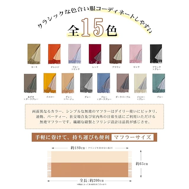 【両面異なるカラー】幅広なので肩にかけたり、ひざにかけたりと様々なシーンで活躍しそうです。リバーシリンジが高品質の証。ぐるぐる巻くだけでも綺麗なアクセントに。防寒、防風、保温効果が素晴らしくて、夏にエアコンの冷房対策の肩掛けとして、秋冬春に保温首巻きとしても最適。