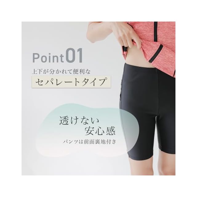 ・半袖 フィットネス水着 セパレートタイプ セット内容:セパレート水着上下 パット付 吸汗 速乾 伸縮性に優れた生地使用 塩素対応で伸縮性に優れ、前面ファスナーで楽に着脱ができるセパレート水着です。 めくれ防止のスナップボタン付パンツは前面裏地付き