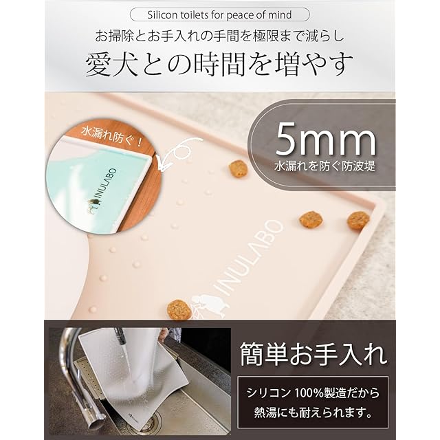 【こだわりのデザイン】縁には漏れ防止の土手を施しています。約5mmととても高い作りの為、簡単には漏れたりはしません。また、無数に張り巡らされた凹凸はシーツがずれにくいデザインに仕上がっています。凹凸は最適なサイズを採用。右下には「INULABO」のロゴをあしらい、非常に洗練されたデザインに仕上がっています。