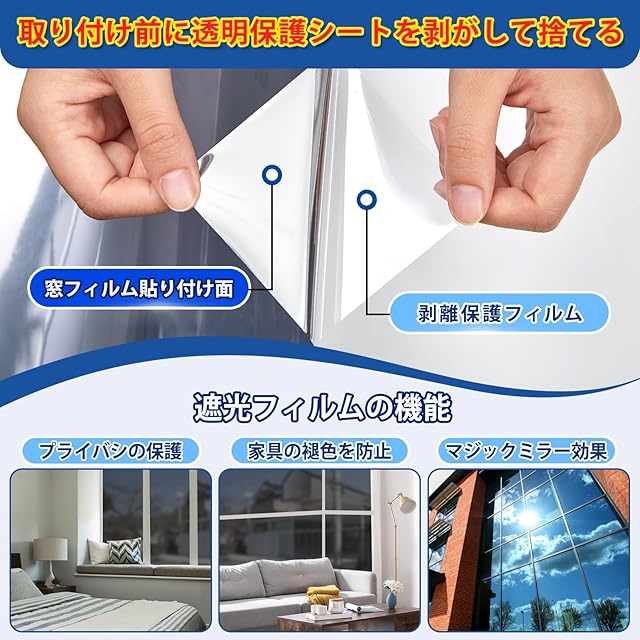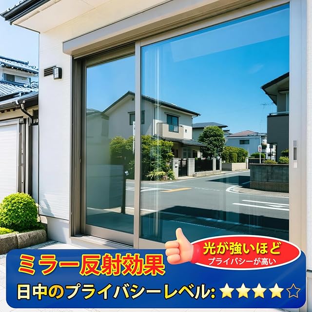 【マジックミラー・目隠し】充分な天然の日光を室内に取り込めて明るさを維持しながら、外からの視線を遮ります。大切なプライバシーをきちんと守ります。昼間は外から見ると鏡のように人影を映す同時に、高い目隠し効果を生かします。室内から見ると、紺色の透明シートに見え、視界を損なわず、気軽に外の風景を眺めます。一般家庭のガラス窓、オフィス、会議室、事務室などの目隠し装飾に非常に適用しています。室内が屋外より明るい場合(夜間、照明を使う場合など)には室内が見えますのでご注意下さい。