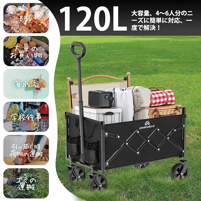 【大容量&高耐荷重で安心して使用】120Lの大容量を備え、アウトドア用品や食品、その他の必需品を持ち運ぶのに便利です。展開時サイズは奥行き72cm、幅45cm、ハンドル高さ68~90cm、折り畳み時は奥行き43cm、幅17cm、高さ68cmとコンパクトで省スペース。キャンプや家族でのピクニックなど、アウトドア活動の携帯ニーズに応える実用的なアイテムです。