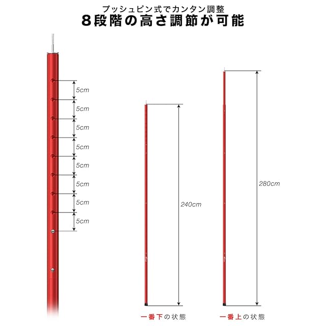 color:【C-03】アルミテントポール(8段階調整 / 4本連結) 2セット / レッド: