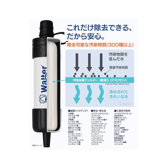 [災害時に、きれいな飲み水を。]災害などで飲料水が手に入らない場合でも、Walterがあれば川の水・雨水・泥水などを清潔な飲み水へと“ろ過”することが簡単。99.9999%の除去率で細菌・不純物を取り除き、安心・安全に水を飲めます。