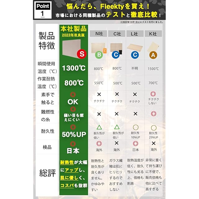 【高級ガラス繊維】第二世代の焚き火台シートは、モノフィラメントの直径がより細かいファイバーグラス(8um)を採用して、普通の耐火シートと比較して、難燃性能と空気密度がより優れています。作業の耐熱温度は800℃で、瞬間使用温度1300℃です。地面へ伝わる「放射熱」を遮り「火の粉」や「燃えかす」がこぼれた時にそれを受け止めます。ページに添付されている実際の耐熱実験動画を直接にご覧いただけます。