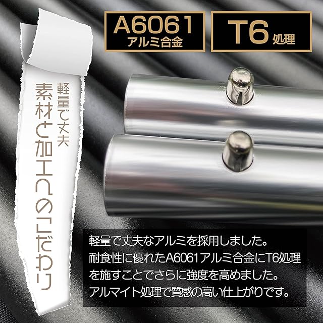 【A6061アルミ合金T6処理加工】耐食性に優れたA6061アルミ合金にT6処理を行い強度をアップしております。耐久性があり、錆などにも強い加工ですので、長くご使用頂けます。