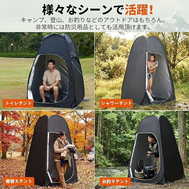 【幅広い用途&防災用トイレテント】防風、防水、日除けなど、簡易トイレとしても便利で、アウトドアのシャワーできることは楽々で最高です。アウトドアテント、災害時の防災テント、防災用トイレテント、着替え用テントなどとして使用可能ですが、海水浴の着替えやシャワールーム、使い方はこれに限らず自由自在!大きさも十分ですので、使い方が広がります。様々な場所やシーンに大活躍!