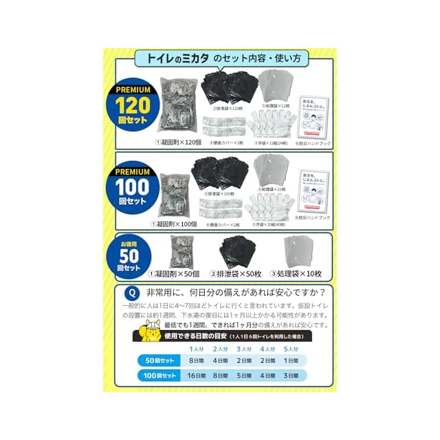 【セット内容】 ・凝固剤 7g×120包 ・排泄袋 120枚 ・処理袋 12枚 ・便座カバー 2枚 ・手袋 24枚(12双) ・防災ハンドブック
