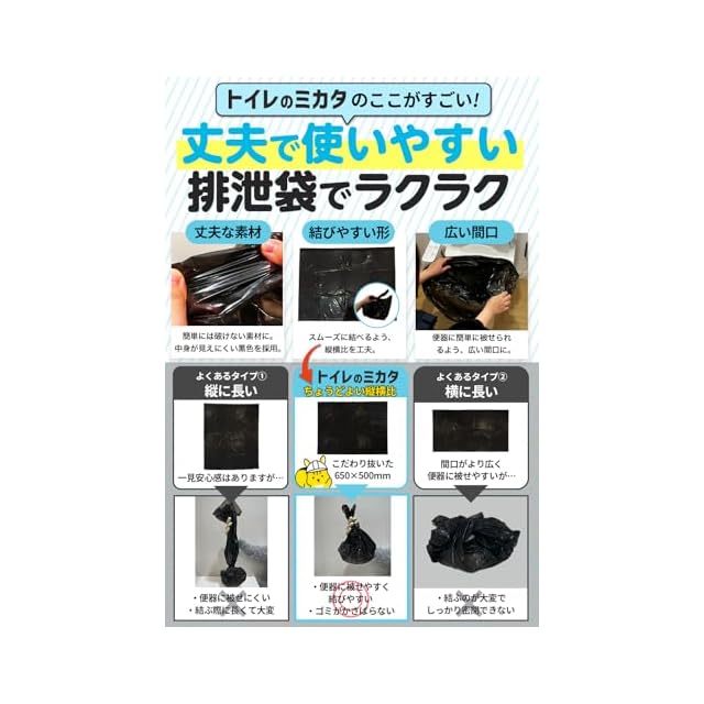 【ご使用方法】 1排泄袋を便器に被せる。 2凝固剤を入れる。 3便座を下して用を足す。 4排泄袋の口を結び、処理袋にまとめて捨てる。