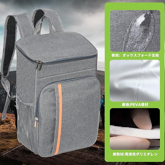 【商品内容】:保冷リュック-本体【素材】:外側:オックスフォード生地、内側:PEVA 【重量】:約0.45kg 【サイズ】: 約29cm×19cm×42cm、折りたたみ時:約42x29x7cm【容量】: 20L 、330mlペットボトル24本収納可能なクーラーボックスです